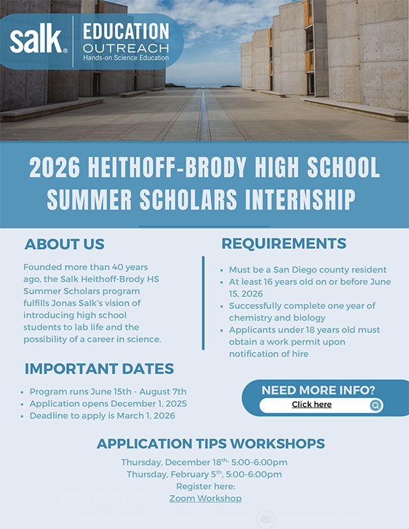 - Interns become part of the Salk ecosystems, connecting with researchers across campus through events, seminars, and collaborative activities that reveal the culture and cutting-edge work of the Institute.